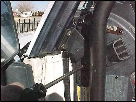 Next we move inside. Take a look at the brackets on each end of the windshield where it connects to the side of the dashboard. Again, work on one side at a time. Remove the bracket and find the similar (but shorter) replacement to install in its place. Notice that this new bracket only attaches at the windshield end. The small hooked end is where it will meet the new clamp. Leave the bracket a bit loose.
